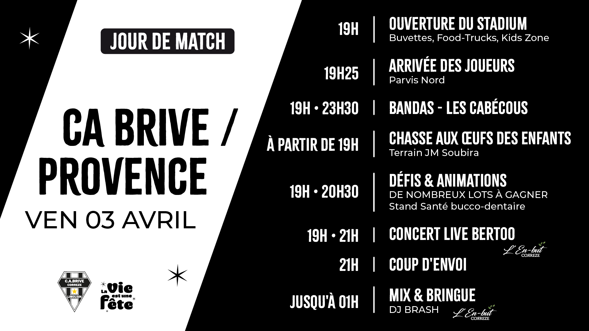 Pour cette nouvelle rencontre à domicile, le CA Brive et la Vie est une Fête s'associent pour faire du Stadium un lieu de vie incontournable. Plus qu'un simple match de rugby, le parvis va devenir un véritable lieu de fête pour tous les supporters Noir et Blanc. Un programme festif et musical à vivre dès l'ouverture des portes, avant, pendant et après le match.