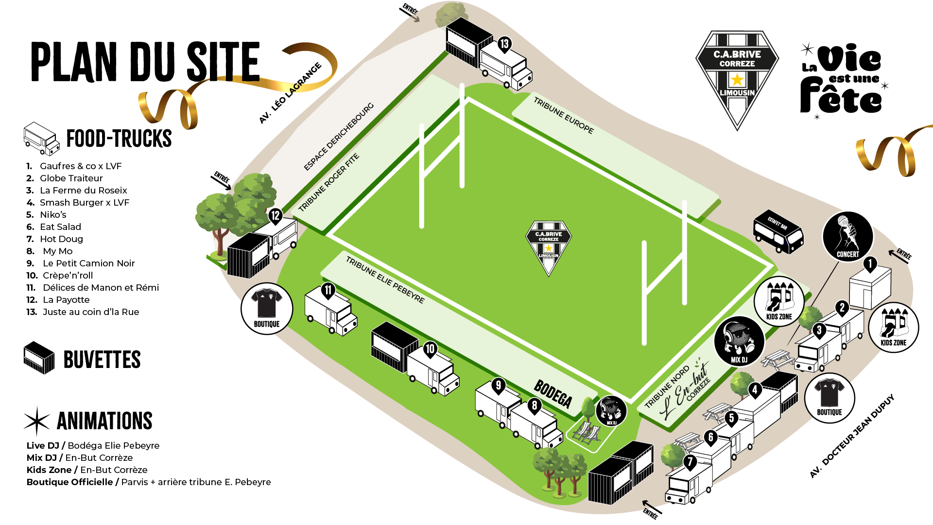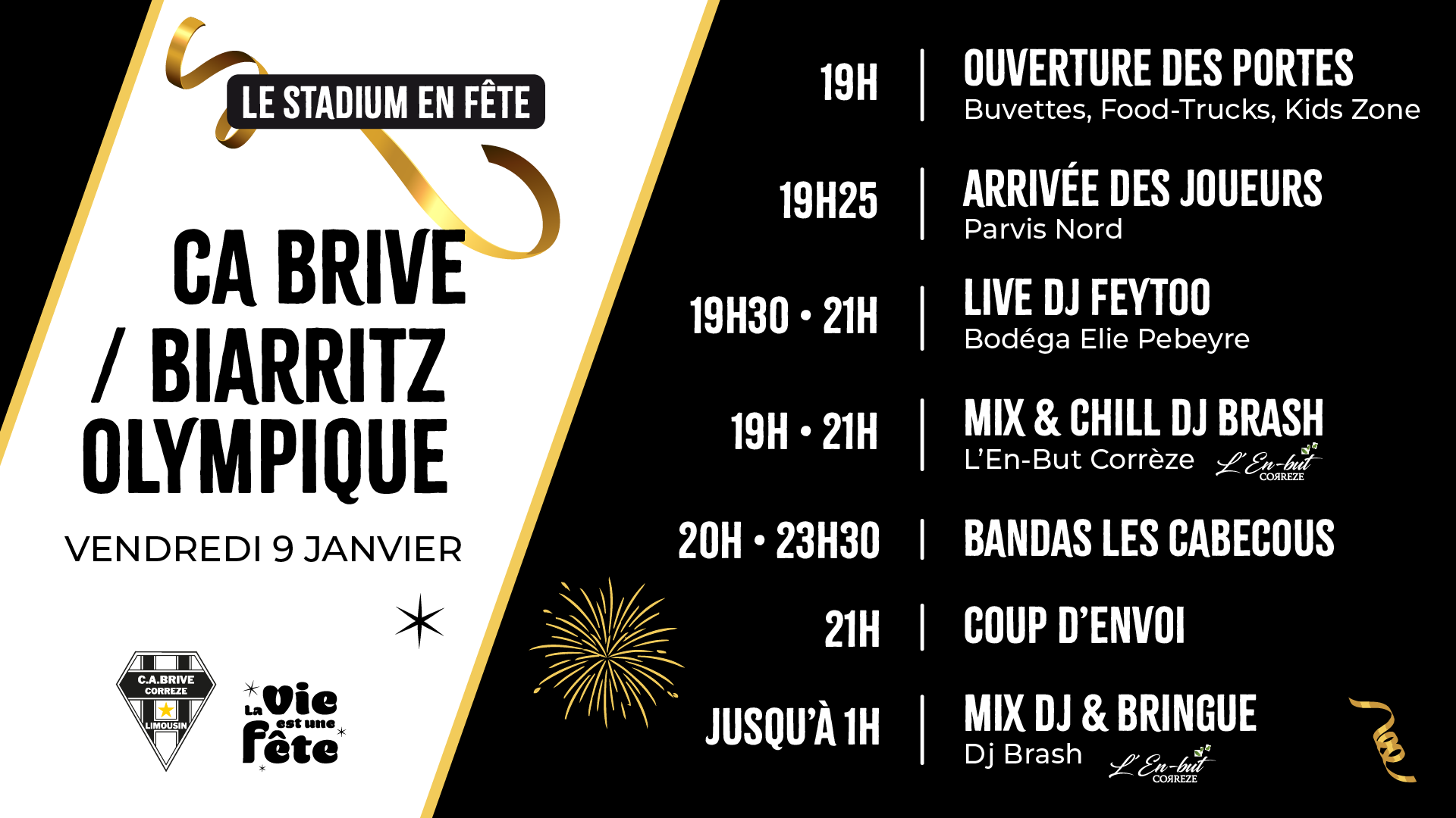 Pour cette nouvelle rencontre à domicile, le CA Brive et la Vie est une Fête s'associent pour faire du Stadium un lieu de vie incontournable. Plus qu'un simple match de rugby, le parvis va devenir un véritable lieu de fête pour tous les supporters Noir et Blanc. Un programme festif et musical à vivre dès l'ouverture des portes, avant, pendant et après le match.